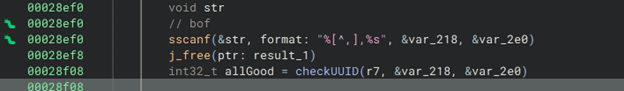 Summary. Stack‑based BOF in UPnP L3Forwarding SetDefaultConnectionService (0x28e8c) due to unconstrained sscanf into a local buffer. PC hijack is possible, but weaponization is constrained by XML parsing (ASCII‑only) and return‑address layout.