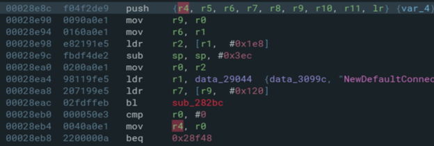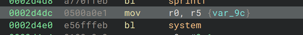 Exploitation. Overwrite saved LR/PC and pivot into a gadget at 0x2d4dc (mov r0, r5 ; bl system) to invoke system() with an attacker‑controlled argument.