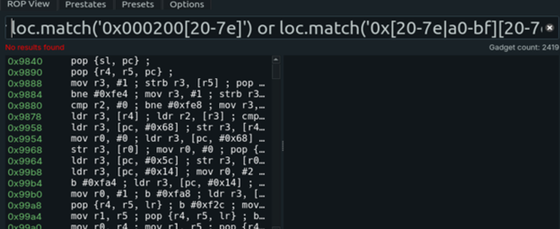 We targeted a known gadget at 0x2d4dc (mov r0, r5 ; bl system).