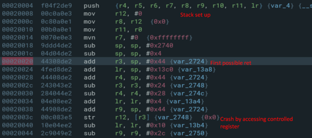 Exploitation. Overwrite saved LR/PC, return to 0x2d4dc (mov r0, r5 ; bl system) with controlled argument.