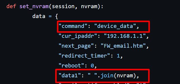 There exists an httpd route that allows configuring arbitrary system information—post.cgi (requires authentication). In the posted data, a command key can contain: device_data, reset_to_default, system_restart, system_reboot. The device_data path lets an authenticated user arbitrarily set NVRAM entries. Various NVRAM parameters are consumed by both httpd and sysinit, enabling persistent and non‑persistent command‑injection scenarios.