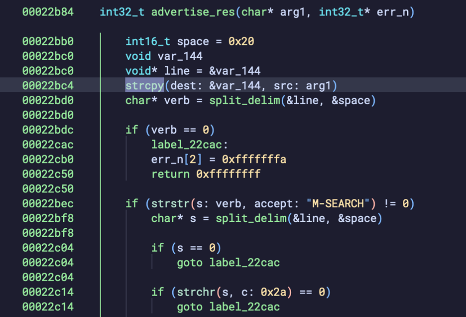 Summary. Stack‑based BOF in UPnP (/usr/sbin/upnp) on M-SEARCH Host header. Root cause is an unbounded strcpy into a fixed‑size stack buffer inside advertise_res (0x22bc4), allowing memory corruption and RCE.