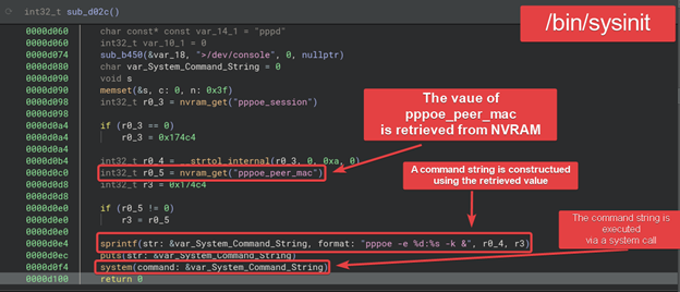 Summary. Authenticated command injection in /bin/sysinit via NVRAM pppoe_peer_mac. Unsanitized value is inserted into a sprintf format and executed via system() during boot, yielding persistent root‑level execution when wan_proto=pppoe.