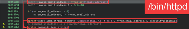 Summary. Authenticated command injection in /bin/httpd email alerts flow. email_address NVRAM is placed into: