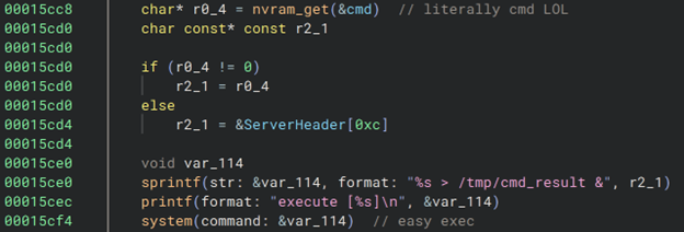 Summary. A rudimentary webshell exists at cmd.cgi (0x15c50). Execution is authenticated (tied to post.cgi). Output formatting is poor but functional.