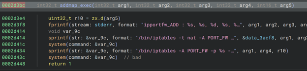 Summary. Unauthenticated command injection in UPnP AddPortMapping (0x2b530) of /upnp/control/WANIPConnection1. The NewInternalClient argument is concatenated into an iptables command that flows to system() (0x2d3bc). WAN‑facing.