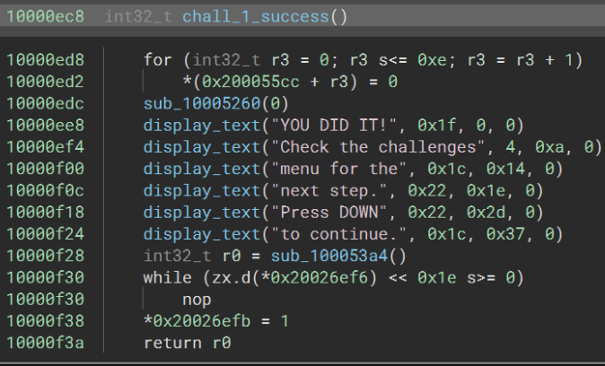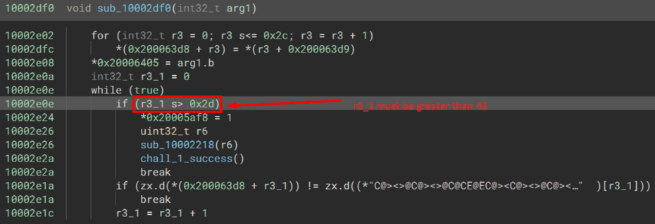 The only code reference leads to the following function. The first thing I noted when initially examining it was the comparison inside the loop to 0x2d. This conditional is equal to if(r3_1 == 0x2d(which is 46)) since the if-statement ends in a break. Examining the note count on my own badge and noting the number of badges with different variations, we know the total number of piano keys that make-up the passing combo is 46, since all badge’s music sheets will be used.