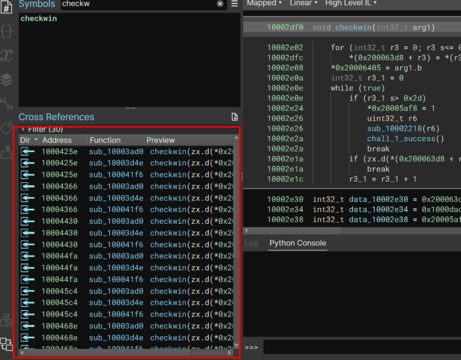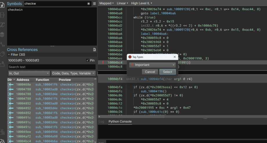 checkwin has a lot of code references. Each call is likely in a blob for a key press. I’ll pin the references window and tag them all to keep everything organized and visible on the pane.
