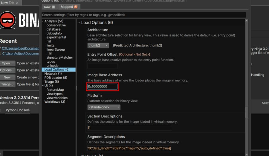 Using Binaryninja I can specify the base address when creating a new project. Binja automatically detects the thumb2 ARM architecture.