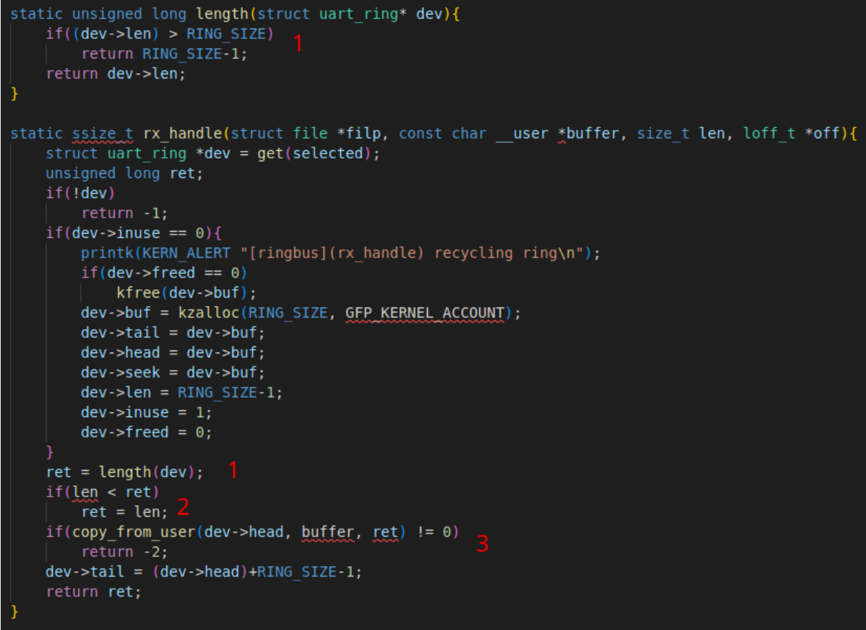 lengthchecks thatdev->lenis less thanRING_SIZE-1. Recall thatdev->lenis set using an ioctl as a defaultsigned int, but returned here as anunsigned long. A user can setdev->lenbeforehand so that it wraps to a negative value (ioctls take anunsigned longargument so you can’t pass a negative value explicitly, so you must also wrap the int when initially setting it), then when this function is called, the comparison will be passed andretwill equal some very large value sincelengthreturns a negative value as anunsigned long.- Because ret is now very large, any len value passed via