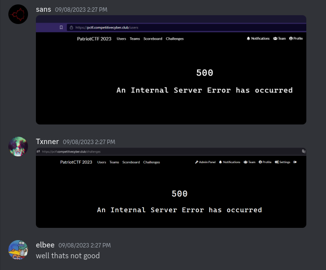 Running a CTF is hard. Very hard. It involves a lot of moving parts and interacting with technology in a way that is considerate and thorough, even if you are not familiar with it. A lot can go wrong at every step — and frequently, a lot does. In acknowledgment of this, I decided to upload this post to make sure that future organizers of PatriotCTF (and their successors) have a reference for the issues their not-so-distant ancestors encountered.