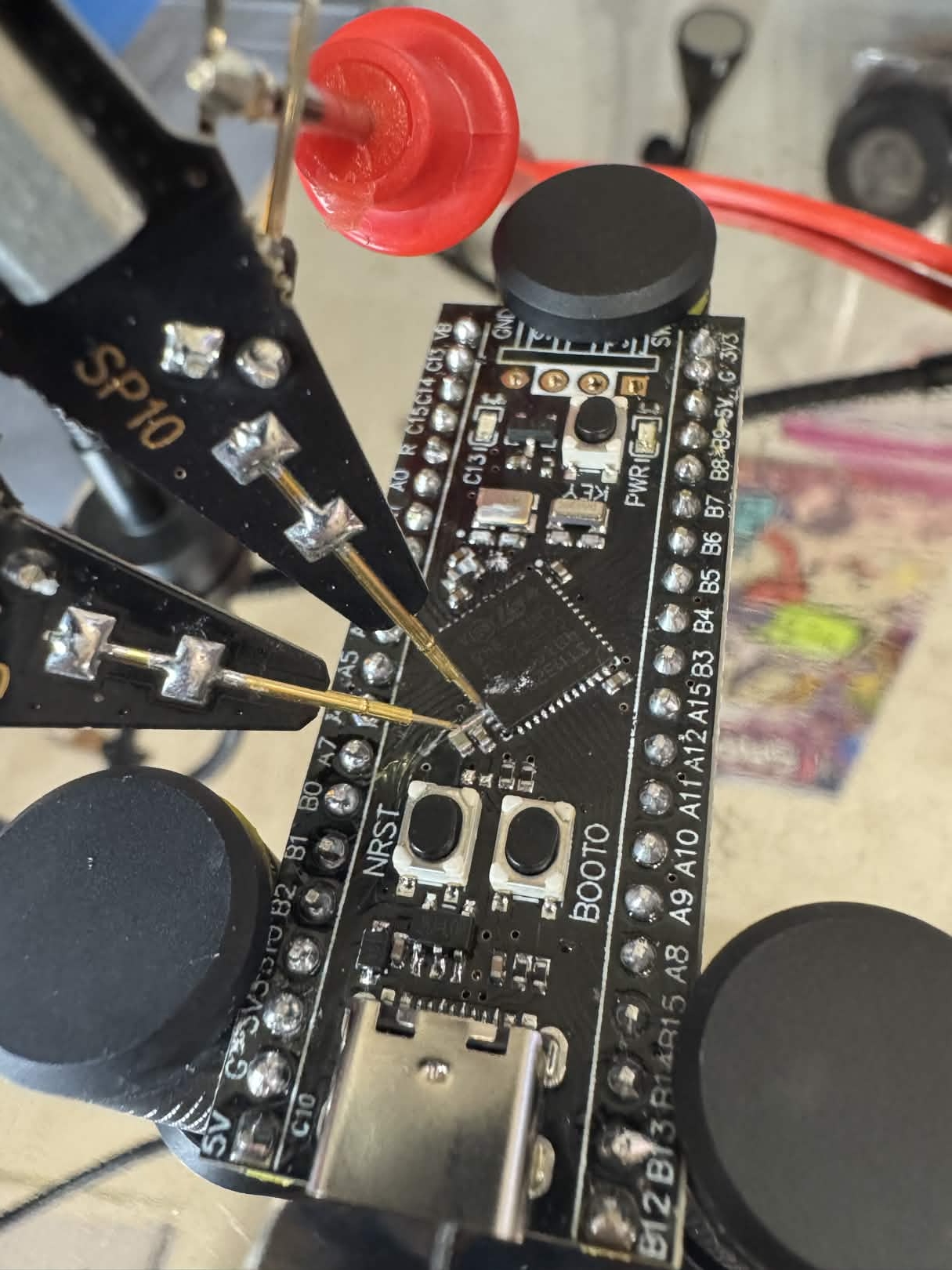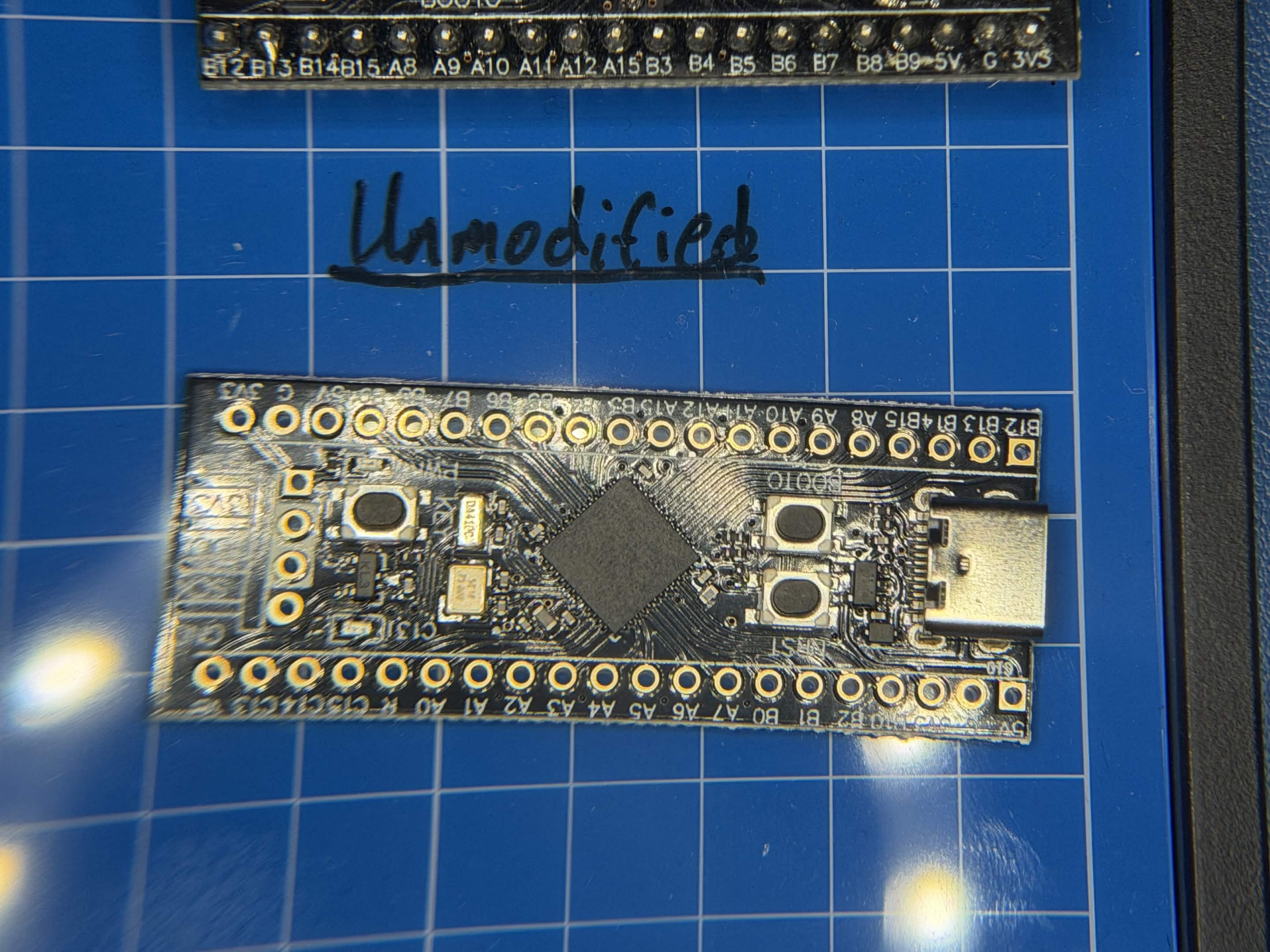 WeAct boards are relatively simple development boards, with support for a large variety microcontrollers that target a range of applications. If you’re situation is “I’m looking for a cheap development board that has this specific microcontroller”, then I wouldn’t feel guilty recommending you WeAct boards in general. They are available on amazon as well as most electronics sites for less than $4 and are simple in design with schematics of their power domain publicly available (here’s our target). At the beginning of my journey, I of course bought many units and carefully destroyed them. Here’s a quick sample of the Blackpill graveyard (some of which are embarassing, but I was still experimenting):
