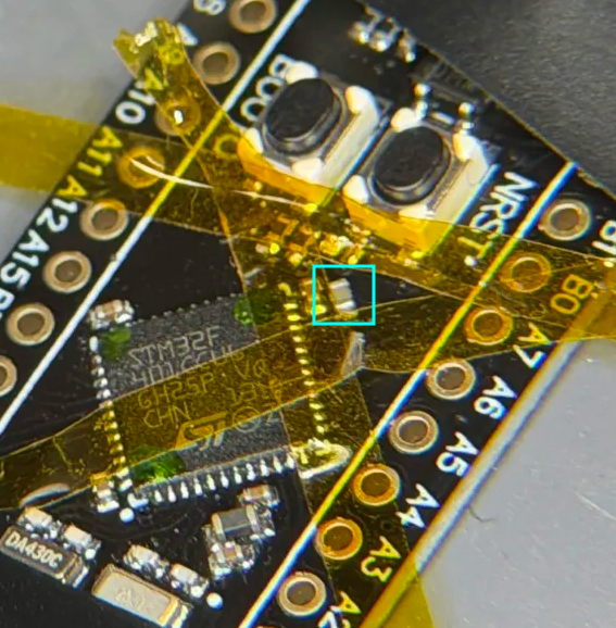 Removing this will not only provide much better SNR, but will also provide a pad we can solder to that lies on a clean and open trace directly to VCAP with no other components on it and far away enough from the chip so as not to damage it with our shenanigans. This is useful because it will disconnect VCAP from ground, allowing us to solder a connection from this pad to a short circuit off-board. This circuit will include our shunt measurement and other components we’ll shortly cover. Remove your decoupling capacitor(s) using a heat gun or a soldering iron and tweezers. It is recommended to apply heat tape to protect surrounding electrical components. Be sure to also constantly clean up your board with flux remover solution if you keep applying bloches to avoid accidental bridges from here on.