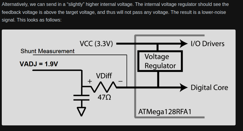 We already know quite a bit about our target’s internal voltage regulator. We also know that we’d like to perform a VCAP node measurement to reflect only core logic. But we also should note that internal regulators themselves are detrimental for power analysis. They actively suppress and flatten the signal we are trying to measure to a specific operating voltage. The job of the LDO is to maintain a constant output voltage regardless of changes. This means if the CPU consumes more current because of a computation we aim to measure, the LDO responds to keep the voltage as stable as possible. It stops us from observing current variations directly or significantly reduces the noise produced from these variations. So how do we deal with them? This sounds like a situation similar to the decoupling capacitor, except unlike the decap we can’t interact directly with the LDO (at least not without red-fuming nitric acid). Luckily for us both our datasheet and NewAE make our path forward quite clear.