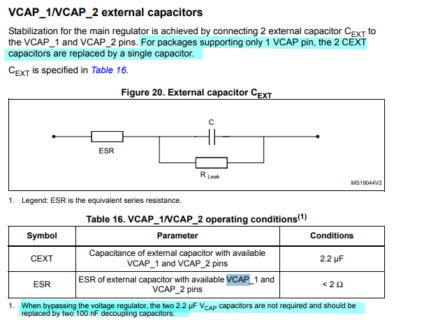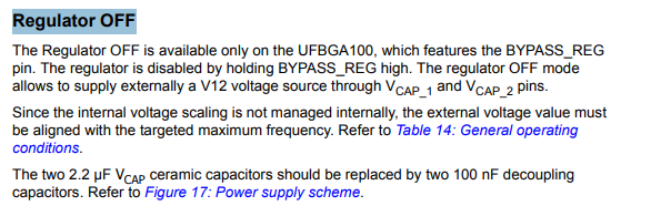 The factory, regulator off, BYPASS_REG is not present on our target, but the datasheet specifies we can supply voltage through the VCAP pins. It also confirms the external voltage supplied is not scaled to the internal expected operating voltage of the LDO and that we should do that, so naturally we won’t.