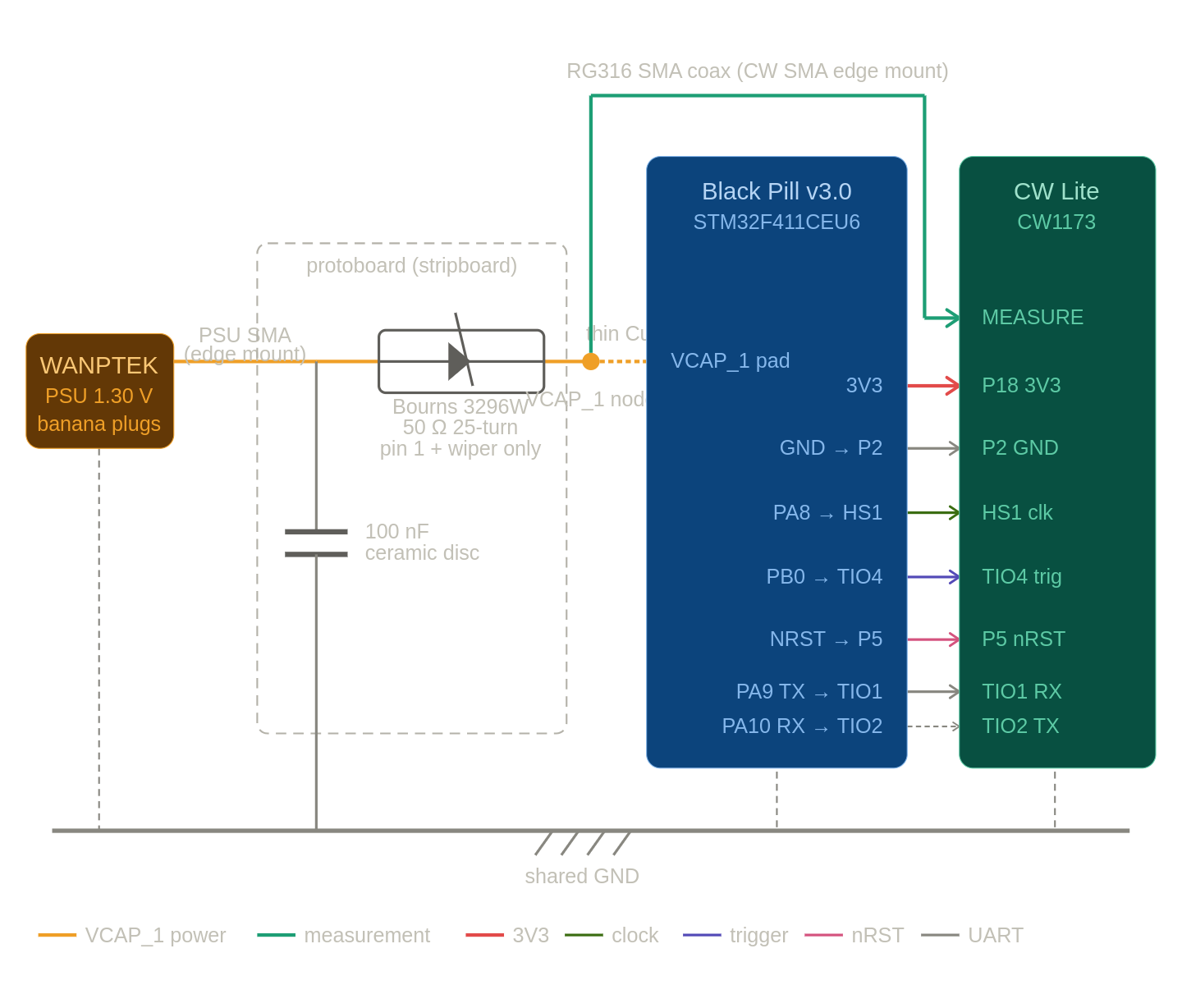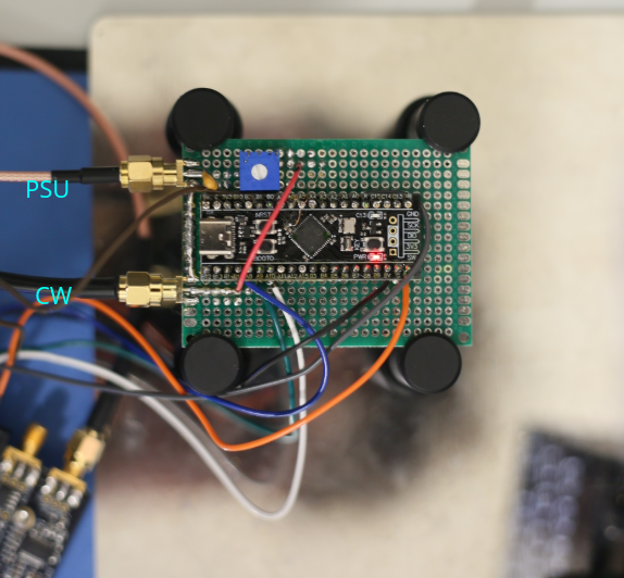 - All grounds must be shared with the chipwhisperer to prevent ground loops. Your entire measurement circuit should share a ground with your chipwhisperer, the CW will take measurements relative to its own ground. The PSU and blackpill should both have a path to chipwhisperer GND.