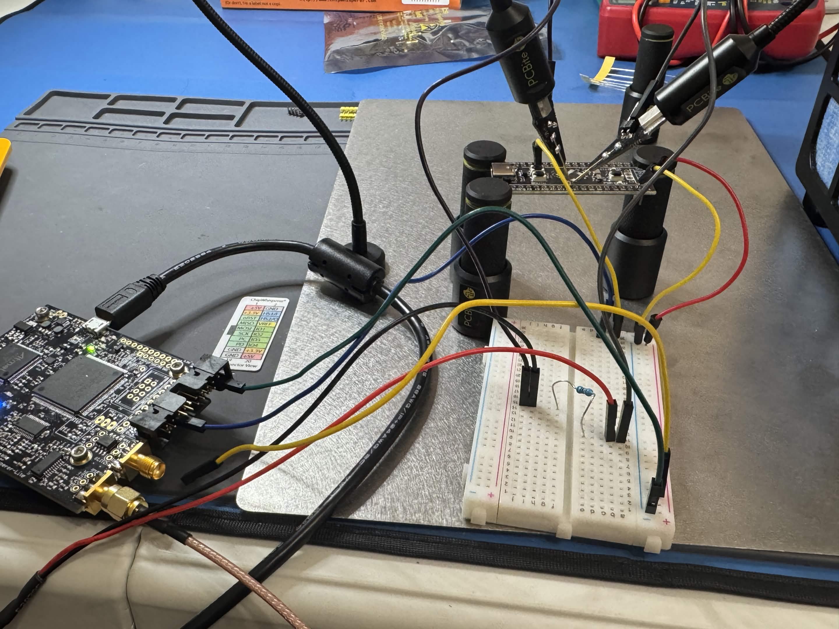 - Physical distance kills SNR. The wire that connects your circuit to your target is the most sensitive connection in the setup. Use thin gauge. Shared ground isn’t optional. Verify your circuit electrically before powering, a short off of the VCAP node can damage the target chip if external power is applied. SNR is the only metric that matters for verification purposes.