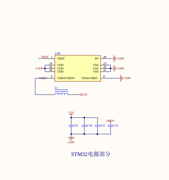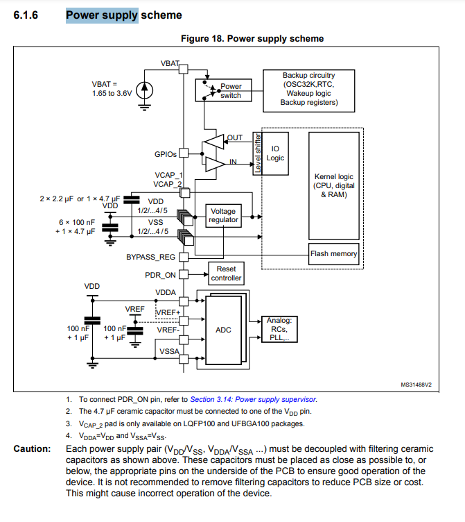 Also recall that the datasheet noted that when the internal regulator is not being used, we should be supplying two 100nF bypass capacitors to our external power supply if VCAP_2 exists. This external supply is not a part of our measurement and we’d like it to be stable and safe from EMI, so we will be adding a single 100nF bypass capacitor to our circuit right off the PSU.